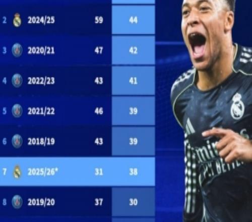 姆巴佩本賽季各項賽事38球位列生涯第7,距個人單賽季紀錄還有6球