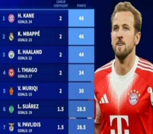 本賽季目前歐洲金靴獎積分榜:凱恩居首,姆巴佩次席、哈蘭德第三
