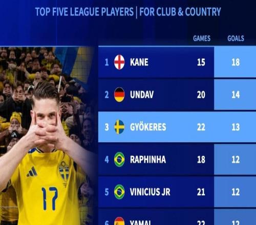 五大聯(lián)賽球員2026年國(guó)家隊(duì)+俱樂(lè)部進(jìn)球榜:凱恩第1,哲凱第3