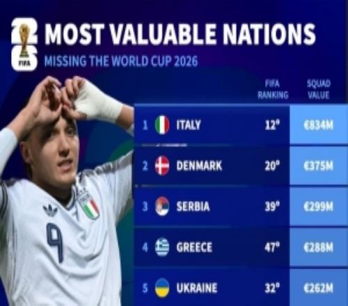 無緣世界杯球隊身價排名:意大利8.34億歐居首,丹麥3.75億歐次席